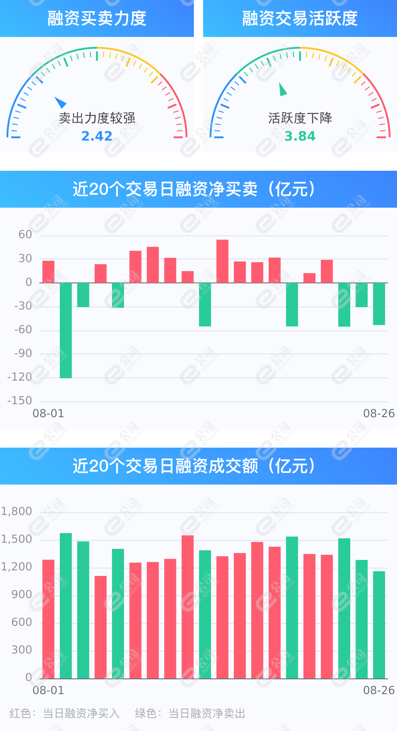 证券时报e公司讯,截至8月26日,上交所融资余额报8137.30亿元,较前一交易日减少32.36亿元;深交所融资余额报7072.18亿元,较前一交易日减少21.03亿元;两市合计15209.47亿元,较前一交易日减少53.40亿元,融资交易额1160.58亿元,占A股成交额12.54%,其中融资买入额553.59亿元,融资偿还额606.99亿元,交易活跃度下降9.58%。
