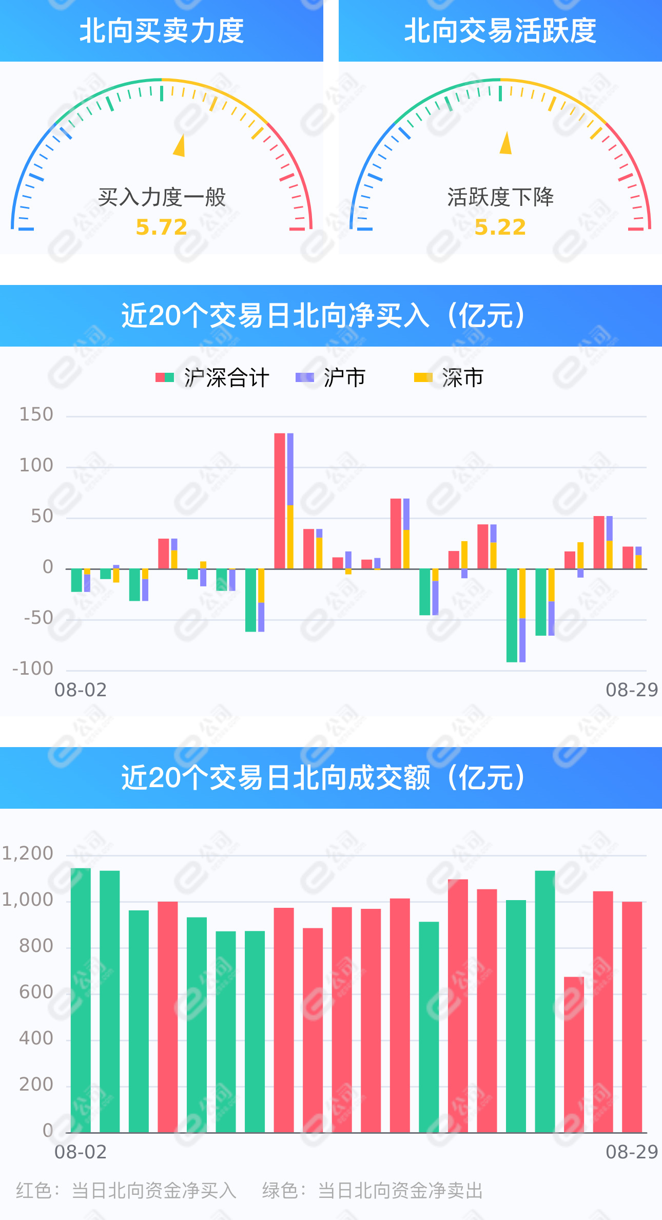 证券时报网讯,8月29日,截至A股收盘,统计数据显示北向资金合计净买入21.45亿元,其中沪股通净买入13.06亿元,深股通净买入8.39亿元。北向资金成交金额997.14亿元,占A股总成交额11.79%,交易活跃度下降4.40%,其中沪股通买入金额228.79亿元,卖出金额215.73亿元,深股通买入金额280.51亿元,卖出金额272.12亿元。