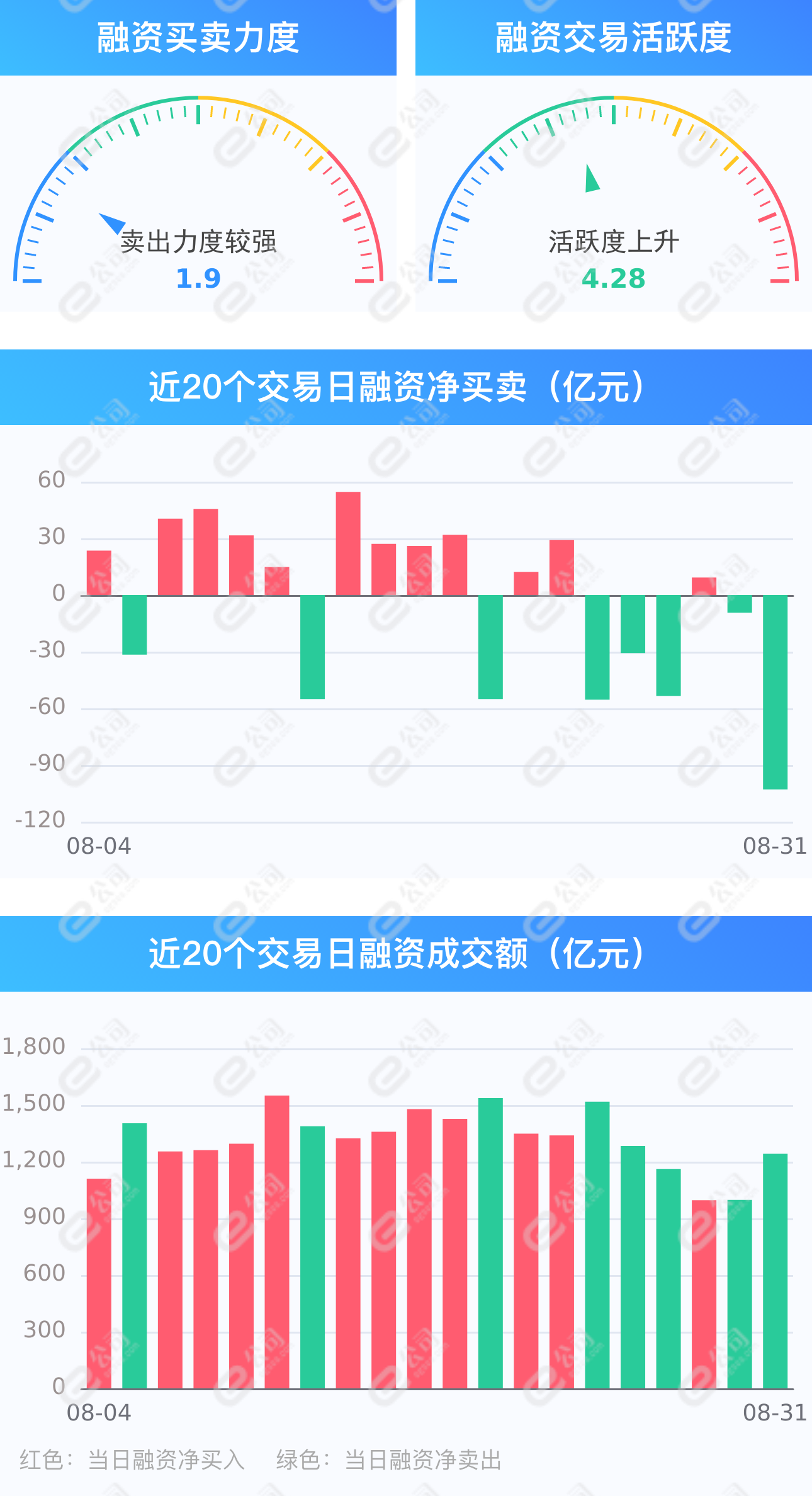 证券时报e公司讯,截至8月31日,上交所融资余额报8077.29亿元,较前一交易日减少52.63亿元;深交所融资余额报7029.17亿元,较前一交易日减少50.25亿元;两市合计15106.46亿元,较前一交易日减少102.88亿元,融资交易额1242.04亿元,占A股成交额12.47%,其中融资买入额569.58亿元,融资偿还额672.46亿元,交易活跃度上升24.49%。
