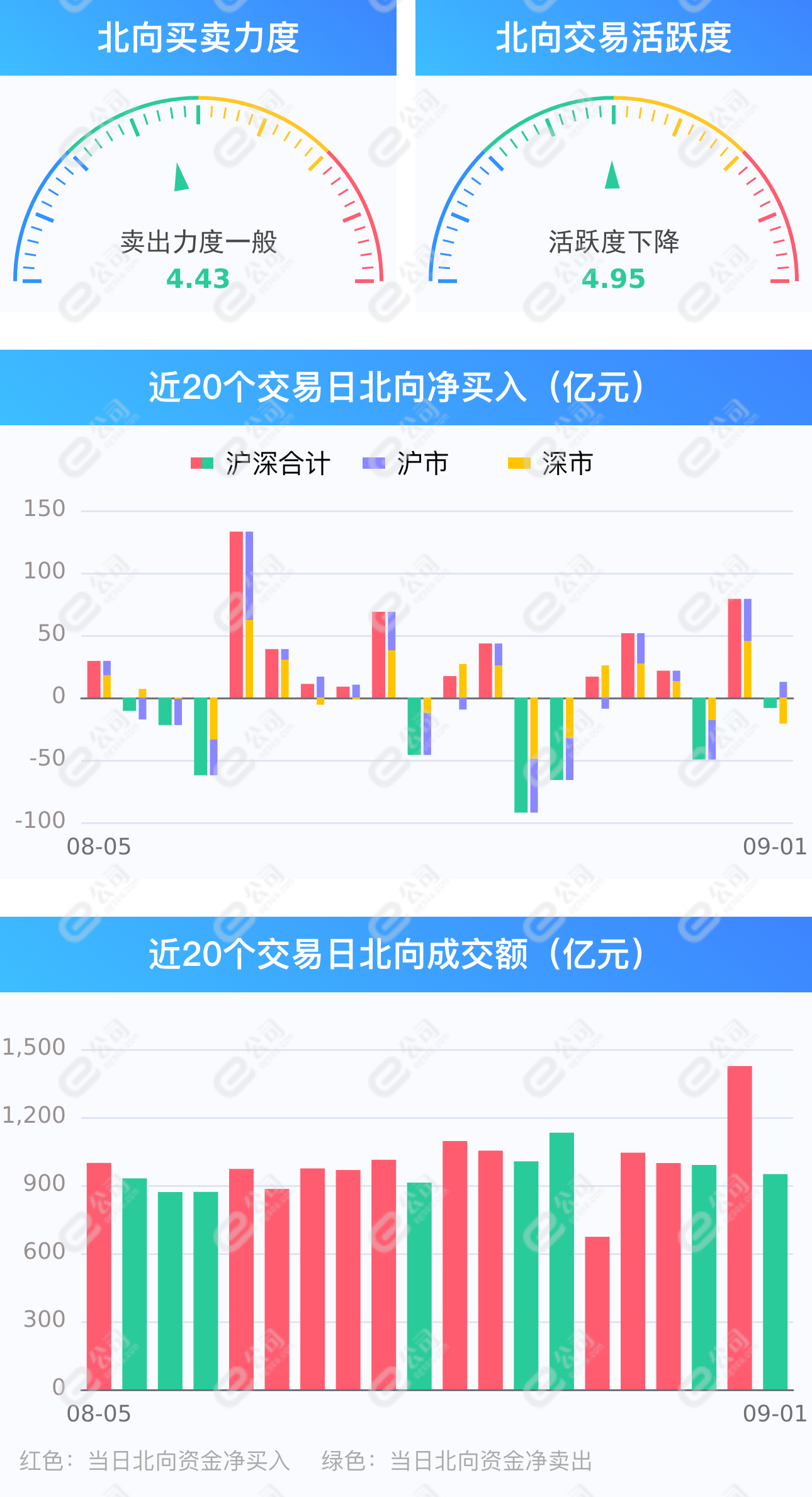 证券时报网讯,9月1日,截至A股收盘,统计数据显示北向资金合计净卖出8.43亿元,其中沪股通净卖出20.93亿元,深股通净买入12.5亿元。北向资金成交金额948.49亿元,占A股总成交额11.93%,交易活跃度下降33.42%,其中沪股通买入金额201.77亿元,卖出金额222.70亿元,深股通买入金额268.26亿元,卖出金额255.76亿元。