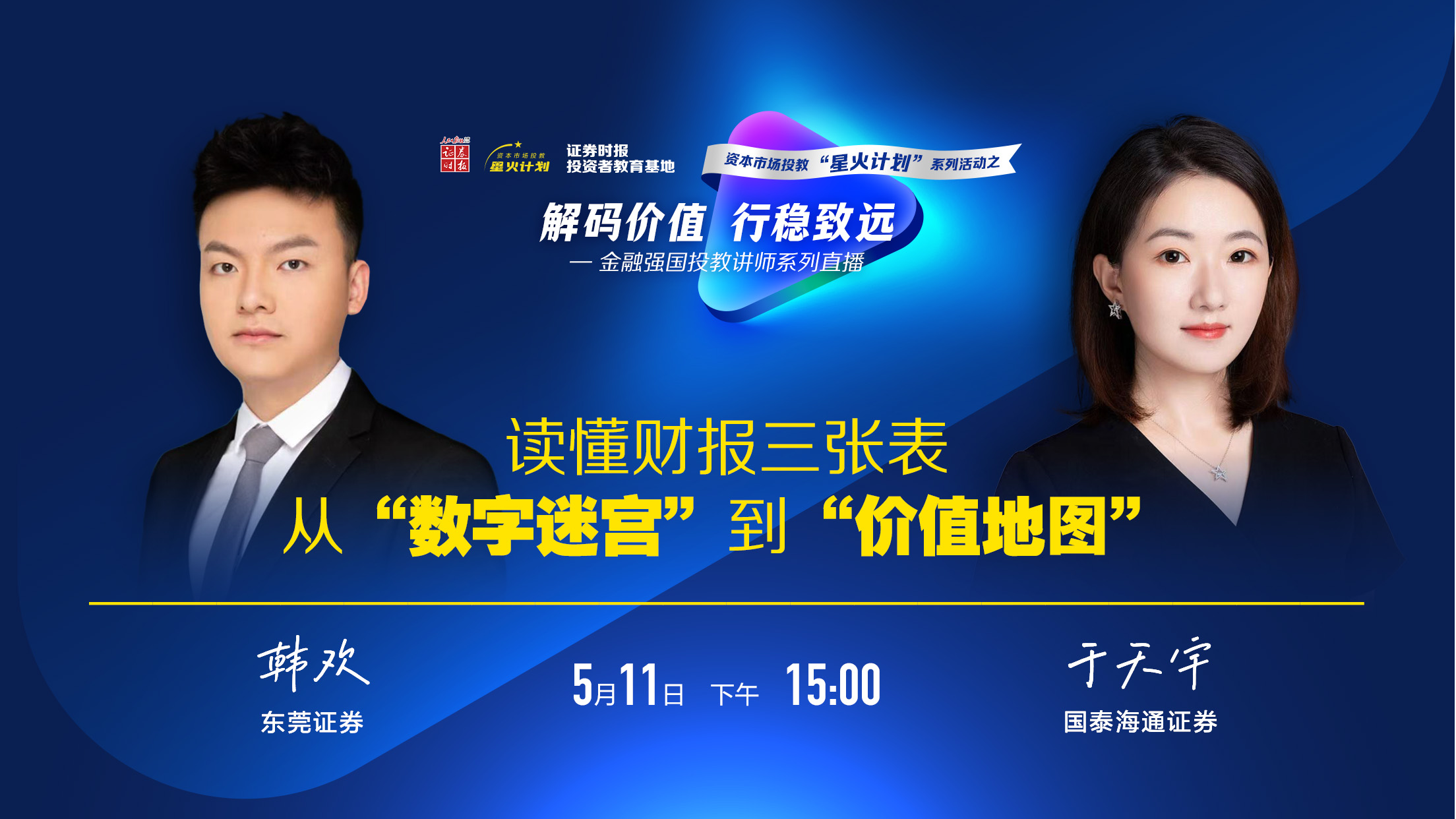 在深交所、上交所、北交所、深圳证监局及中证投服中心的指导下,证券时报推出"坚守价值初心,践行长期投资"资本市场投教"星火计划"系列活动。活动以"五个一"为核心:一场投教作品展播、一周深度直播、一场线下座谈会、一份投教特刊及一个云端投教专题,通过多元立体形式,为投资者打造扎实的知识盛宴。其中,"一周深度直播"以"解码价值,行稳致远"为主题,邀请"金融强国投教讲师库"资深讲师围绕价值投资与长期投资进行系列化深度讲解。5月11日15:00,《读懂财报三张表:从"数字迷宫"到"价值地图"》即将开播,敬请关注。