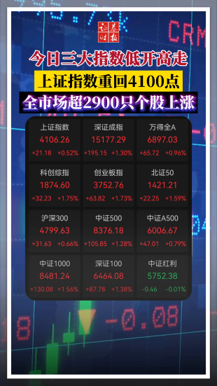 今日三大指数低开高走 上证指数重回4100点 全市场超2900只个股上涨