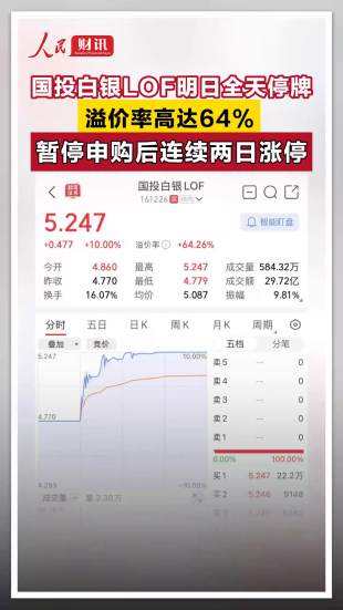 国投白银LOF明日全天停牌,溢价率高达64%,暂停申购后连续两日涨停