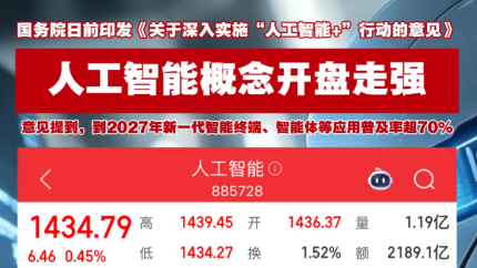 国务院印发《关于深入实施“人工智能+”行动的意见》 人工智能概念开盘走强