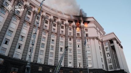 乌克兰政府大楼首次遭俄军袭击 来袭的无人机残骸坠落致乌政府大楼起火 目前已致2人死亡、18人受伤