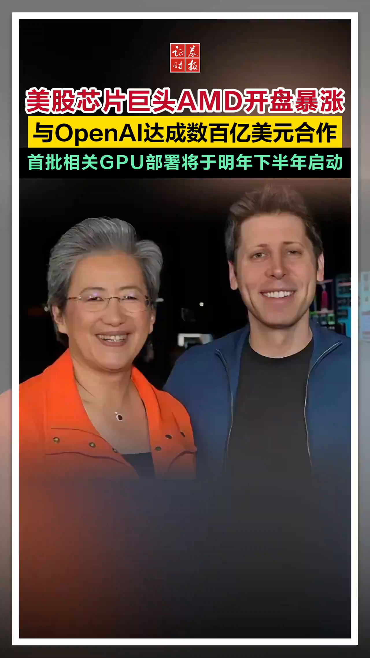 美股芯片巨头AMD开盘暴涨,与OpenAI达成数百亿美元合作,首批相关GPU部署将于明年下半年启动