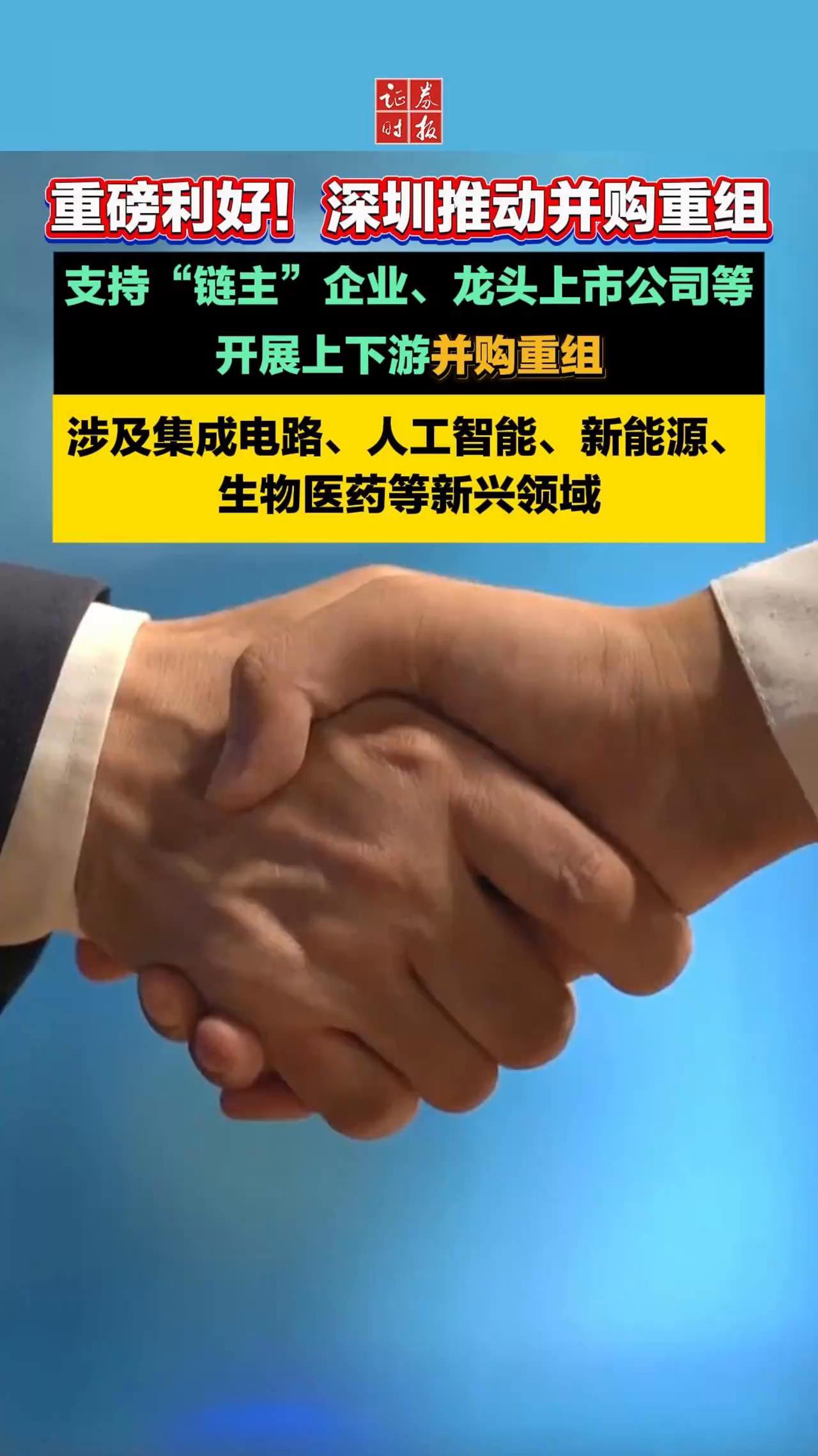 重磅利好!深圳推动并购重组,支持“链主”企业、龙头上市公司等开展上下游并购重组,涉及集成电路、人工智能、新能源、生物医药等新兴领域