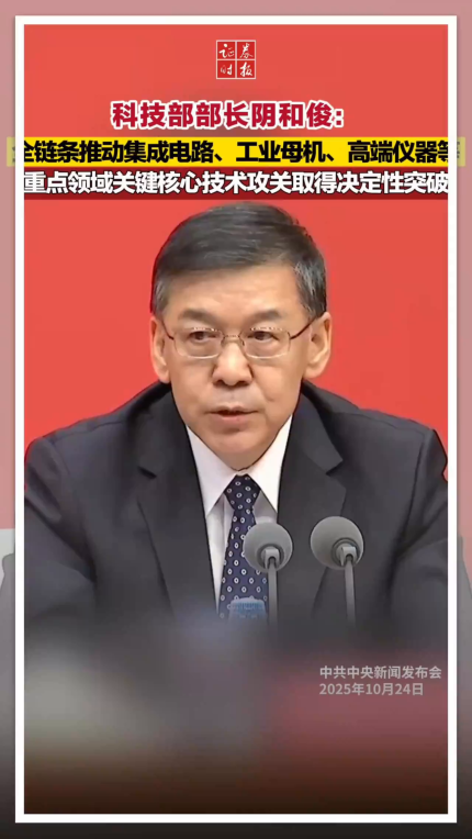 科技部部长阴和俊: 全链条推动集成电路、工业母机、高端仪器等 重点领域关键核心技术攻关取得决定性突破