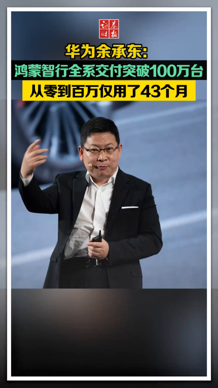 华为余承东:鸿蒙智行全系交付突破100万台,从零到百万仅用了43个月