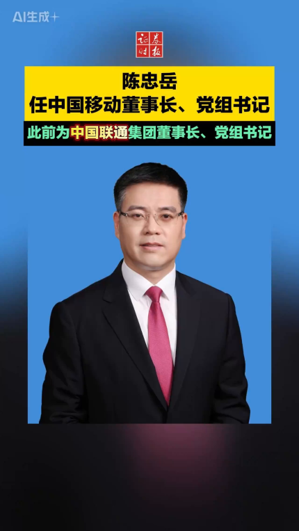 陈忠岳任中国移动集团董事长、党组书记,此前为中国联通集团董事长、党组书记