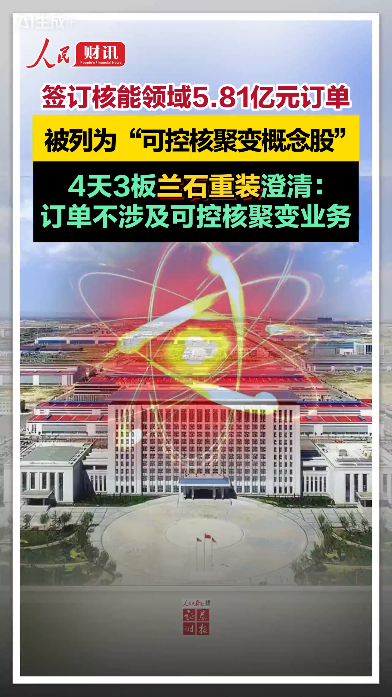 签订核能领域5.81亿元订单,被列为“可控核聚变概念股”,4天3板兰石重装澄清:订单不涉及可控核聚变业务