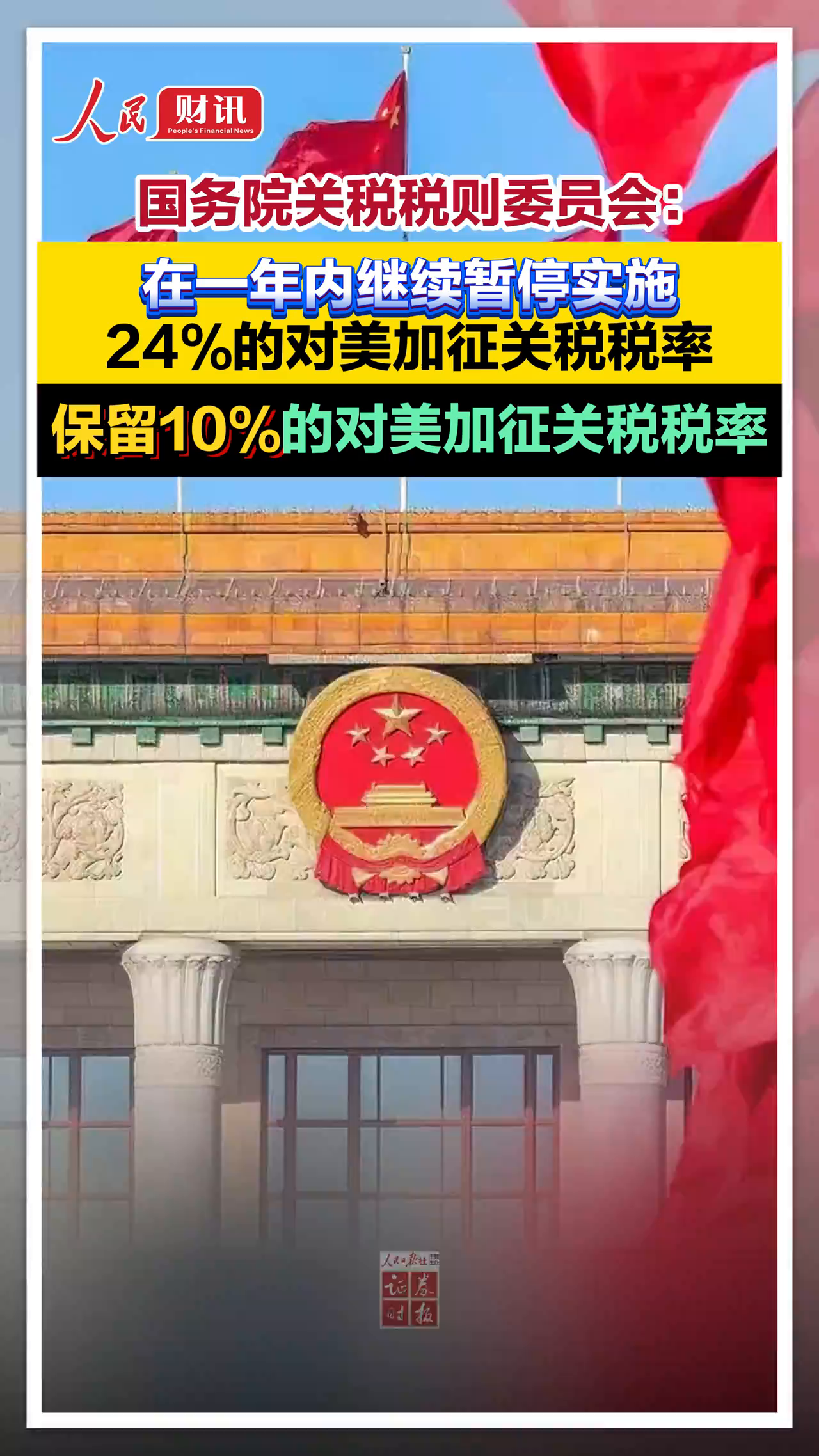 国务院关税税则委员会:在一年内继续暂停实施24%的对美加征关税税率,保留10%的对美加征关税税率