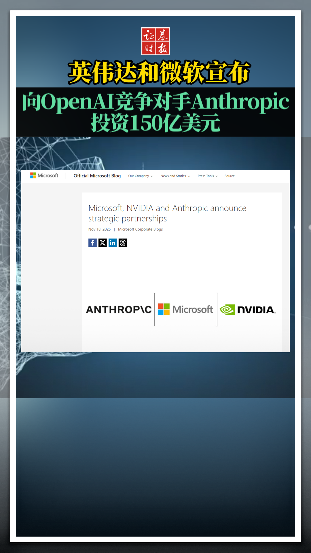 英伟达和微软宣布向OpenAI竞争对手Anthropic投资150亿美元