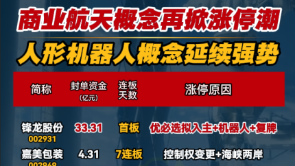 商业航天概念再掀涨停潮 人形机器人概念延续强势