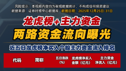 龙虎榜+主力资金近五日流向曝光!(2025年12月25日~12月31日)