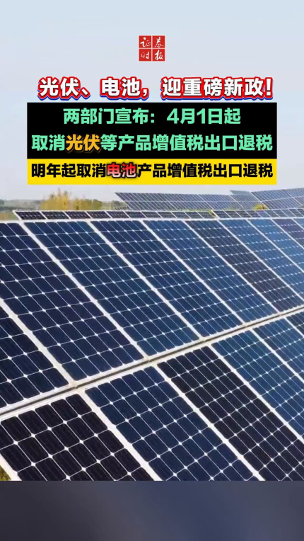 光伏、电池,迎重磅新政!财政部、税务总局:4月1日起取消光伏等产品增值税出口退税,明年起取消电池产品增值税出口退税