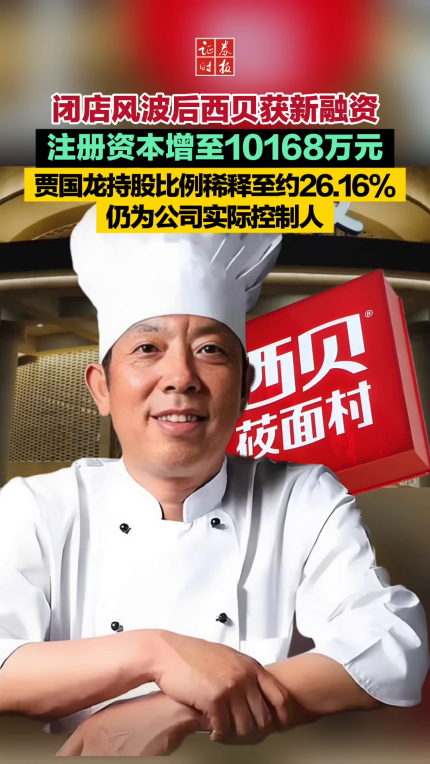 闭店风波后西贝获新融资 注册资本增至10168万元 贾国龙持股比稀释至约26.16% 仍为公司实际控制人