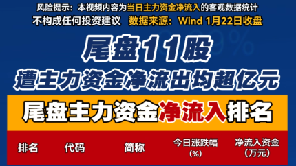 尾盘11股遭主力资金净流出均超亿元(数据截至:1月22日)