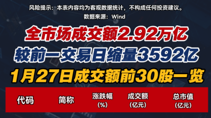 1月27日全市场成交额2.92万亿 较前一交易日缩量3592亿
