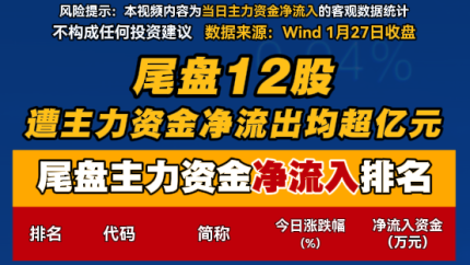 尾盘12股遭主力资金净流出均超亿元