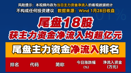 尾盘18股获主力资金净流入均超亿元