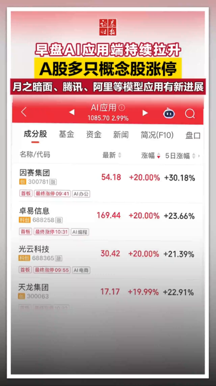早盘AI应用端持续拉升,A股多只概念股涨停,月之暗面、腾讯、阿里等模型应用有新进展