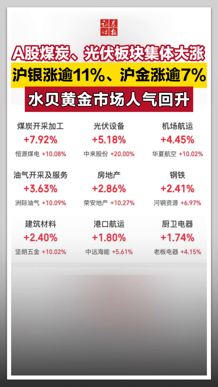 A股煤炭、光伏板块集体大涨,沪银涨逾11%、沪金涨逾7%,水贝黄金市场人气回升