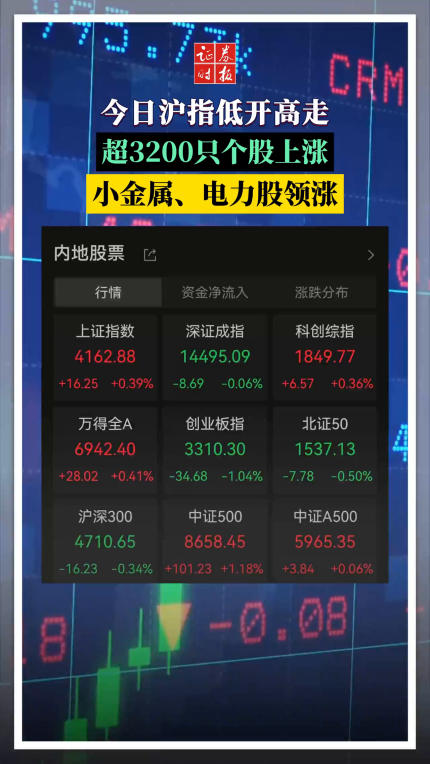 今日沪指低开高走,全市场超3200只个股上涨,小金属、电力股领涨