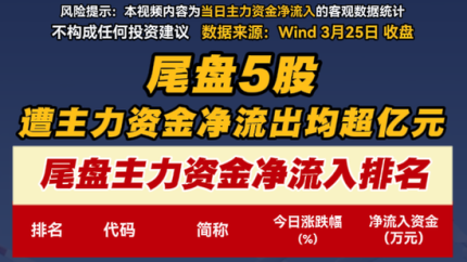 尾盘5股遭主力资金净流出均超亿元