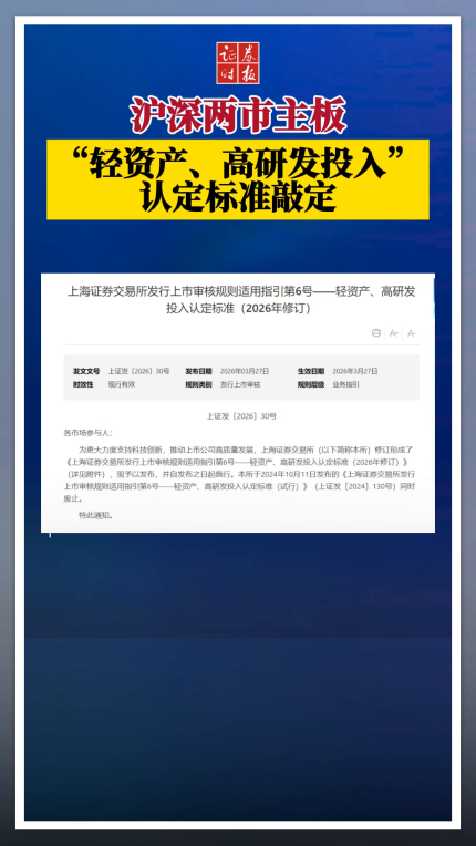 沪深两市主板“轻资产、高研发投入”认定标准敲定
