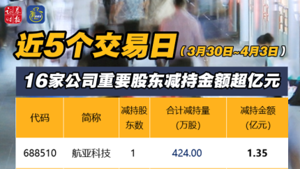 近5个交易日16家公司重要股东减持金额超亿元(3月30日~4月3日)