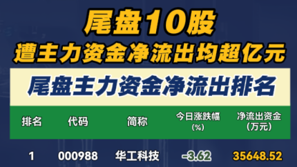 尾盘10股遭主力资金净流出均超亿元