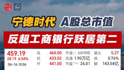 宁德时代A股总市值反超工商银行跃居第二
