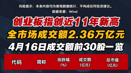 创业板指创近11年新高 A股全市场成交额2.36万亿元