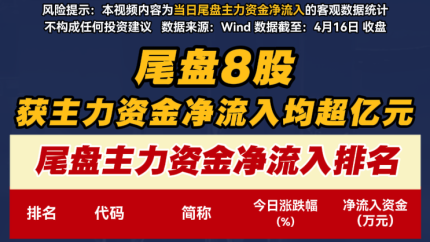 尾盘8股获主力资金净流入均超亿元