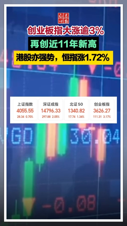 创业板指大涨逾3%,再创近11年新高。港股亦强势,恒指涨1.72%