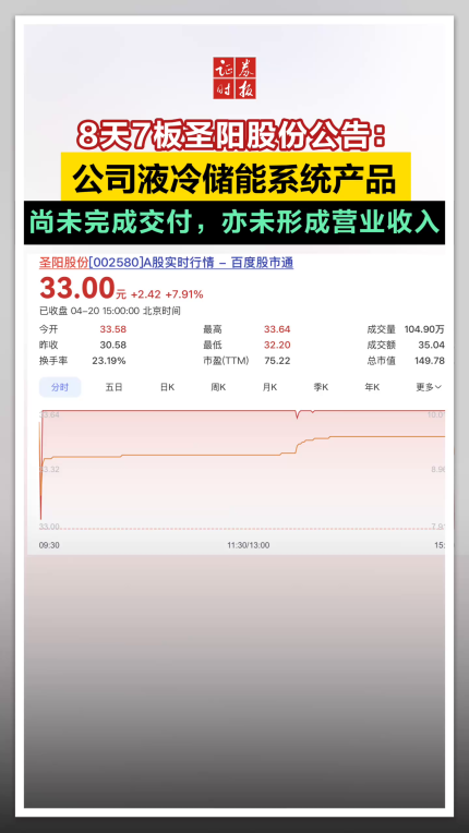 8天7板圣阳股份公告:公司液冷储能系统产品尚未完成交付,亦未形成营业收入