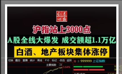 沪指站上3000点,A股全线大爆发,成交额超1.1万亿。白酒、地产板块集体涨停!