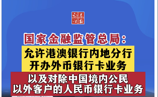 【国家金融监管总局:允许港澳银行内地分行开办外币银行卡业务以及对除中国境内公民以外客户的人民币银行卡业务】
