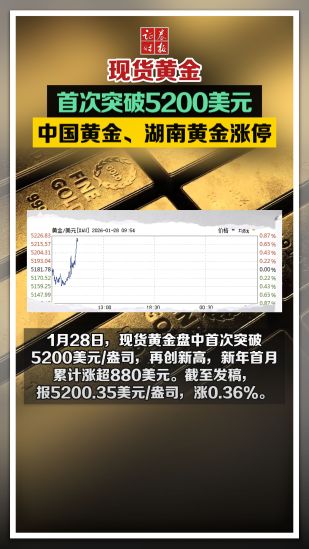 现货黄金首次突破5200美元,中国黄金、湖南黄...