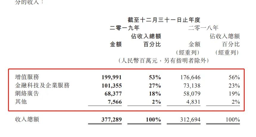 从业务板块来看,2019年全年,腾讯包含游戏在内的增值服务收入1999.9亿,占比53%,其中游戏收入达1147亿;金融科技及企业服务收入达1013.6亿,占比27%,其中腾讯云收入超170亿元;网络广告业务收入683.8亿,占比18%;其它收入达75.7亿,占比2%。
