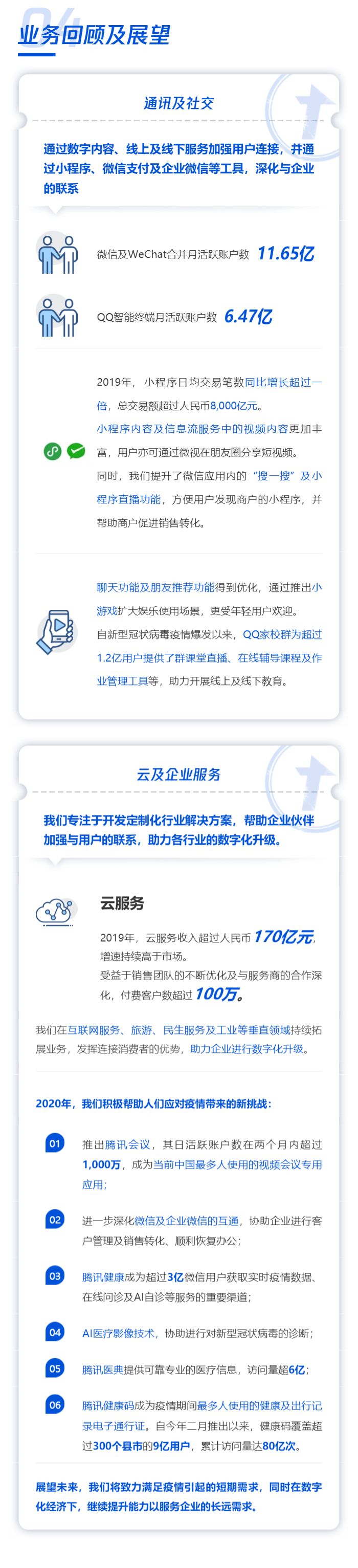 值得一提的是,云服务营收超170亿元,增速持续高于市场,付费客户数超过100万。腾讯产业互联网多项抗“疫”产品数据公布:腾讯会议在推出两个月内,日活跃账户数超过1000万;腾讯健康覆盖超3亿微信用户,腾讯医典访问量超过6亿;健康码被超过300个县市的9亿用户使用,累计访问量达80亿次。