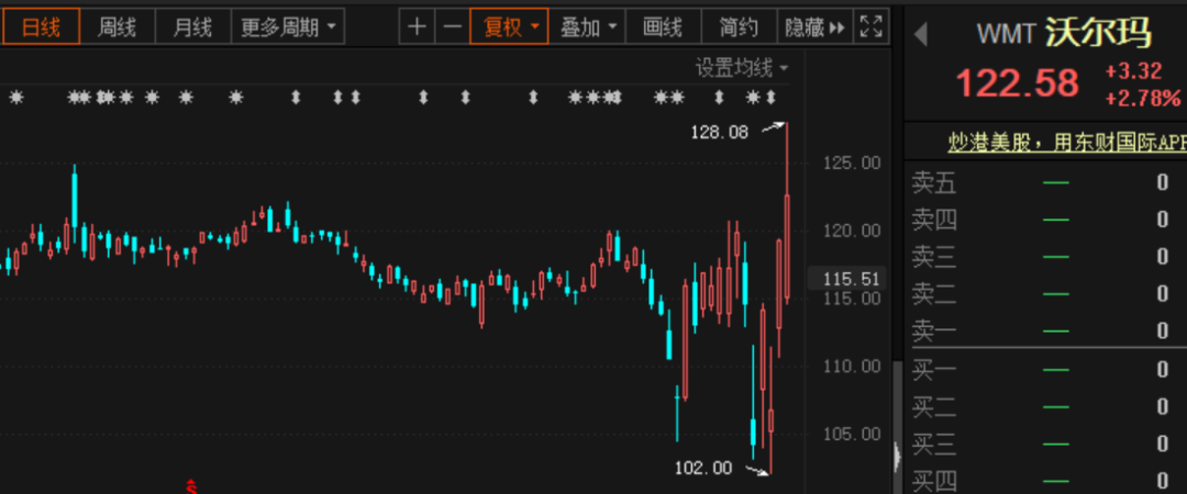 但就是在美股接连暴跌中,沃尔玛却逆市上扬,截至收盘上涨3.08%,盘中一度创出128.08元的历史新高。此前沃尔玛获瑞士信贷上调评级至“跑赢大盘”,但新高的股价已超过瑞士信贷给出的目标价127美元。