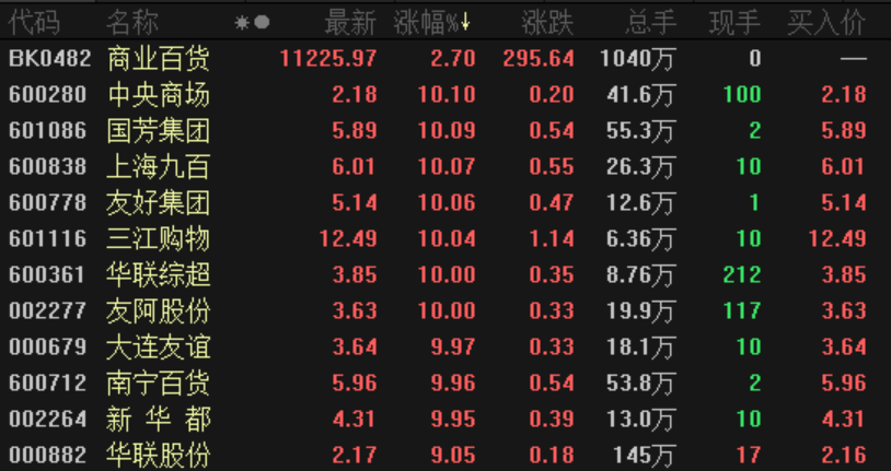 在沃尔玛强势带动下,今日A股商业连锁板块也逆市上涨,截至午间收盘,板块指数涨1.22%,半日成交超昨日全天成交。中央商场、国芳集团、上海九百、华联综超等10股涨停,华联股份、合肥百货、家家悦等涨幅居前。