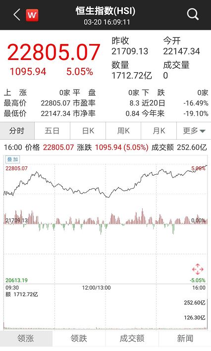行情数据显示,周五港股一改此前低迷态势,全天保持上涨,临近尾盘涨幅进一步扩大,截至收盘,恒生指数报22805.07点,上涨超过1000点, 涨幅达到5.05%。