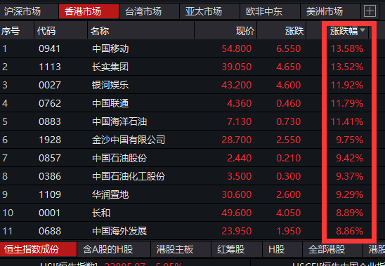 此外,银河娱乐、中国联通、中国海洋石油涨幅也超过10%。