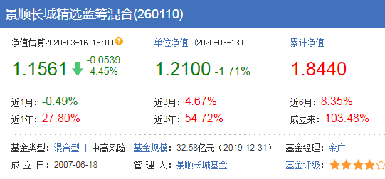 此后,景顺长城精选蓝筹基金再没有面临净值亏损的状况,虽然也从1.432元逐步回落到1.1元附近甚至更低,但基金一直保持盈利。到2020年3月初,景顺长城精选蓝筹基金的累计净值已经高达1.938元,目前这只当年火爆发行的超大规模网红基金累计收益率超过100%。