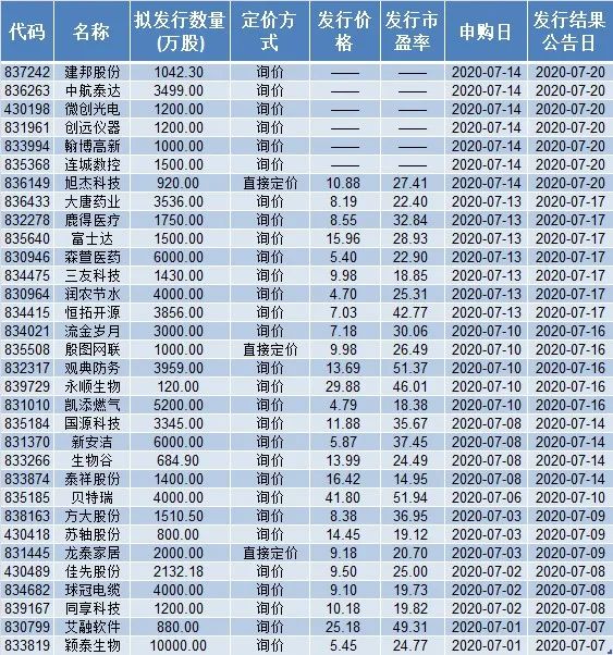 7月10日,殷图网联等5只精选层新股进行申购。本周启动公开发行的挂牌公司密集询价,7月9日晚间,8只新股发行价格出炉,其中森萱医药等7只股票将于7月13日申购。