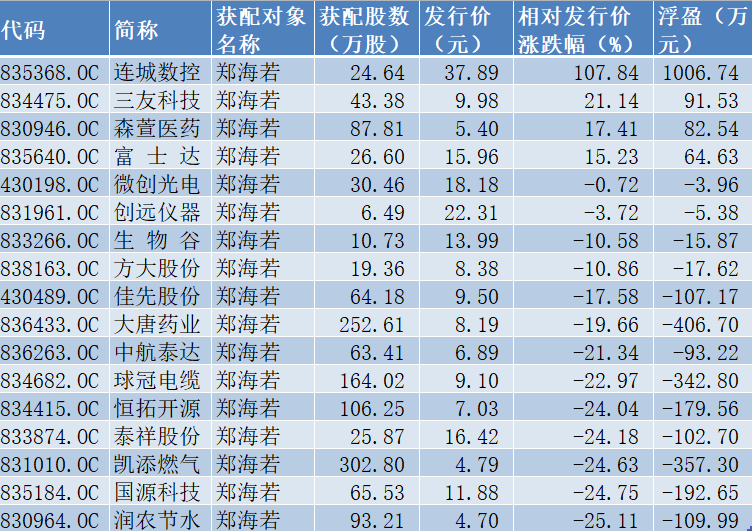 不过,在其参与的17只个股中,仅有连城数据、三友科技、森萱医药和富士达4只录得涨幅。其获配43.3805万股连城数据,该股目前相较发行价已累计涨107.84%,郑海若在这只股票上浮盈达到1006.74万元。在三友科技、森萱医药和富士达的浮盈也均超过60万元。不过,其参与的润农节水、国源科技、凯添燃气、泰祥股份、恒拓开源等开板以来跌幅均超过20%,每只浮亏超过100万元。整体上看,如果郑海若中签的股票全部持有至今,目前浮亏金额达到689万元。