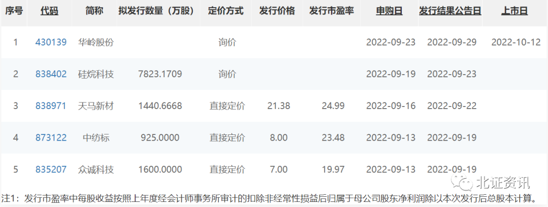 目前北交所处于公开发行阶段的已有5只股票,其中中纺标、众诚科技已于今天启动申购,天马新材也将于9月16日启动申购,这三家均采用直接定价方式;而硅烷科技、华岭股份则将采访询价方式,其中华岭股份已确定上市日为10月12日。